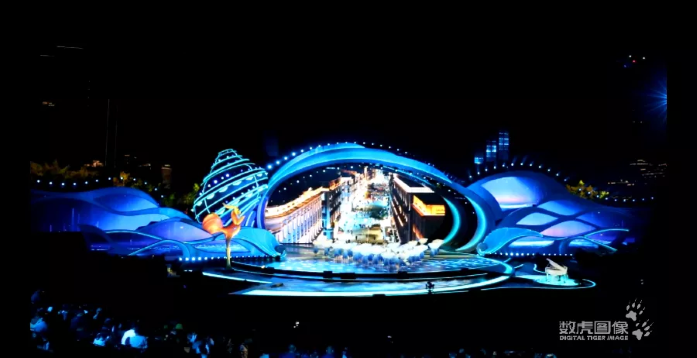 央视综艺节目《国家宝藏》, 数虎图像根据前期舞台模型及台型变化,进行现场视觉效果模拟和舞美影像设计。通过长43米、高7米的巨型LED环幕、 车台载投影纱盒、九块透明冰屏墙以及地屏,错落有致的台型变化……多种舞美设计配合,高通透的影像颜值, 带来大气磅礴的舞台视觉效果。